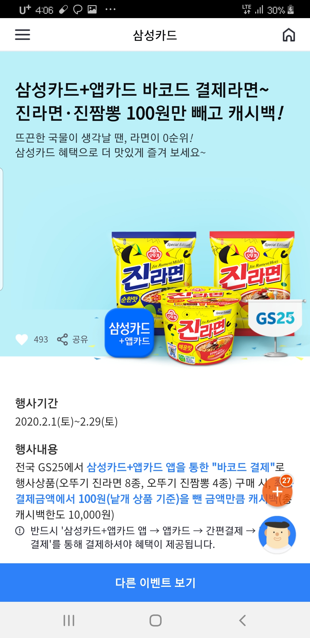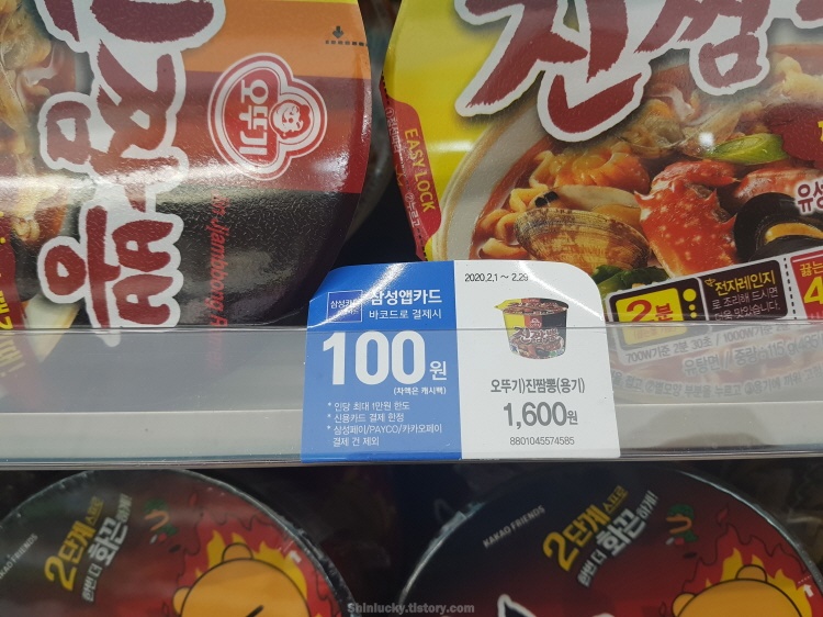 GS25 편의점에서 삼성카드+앱카드 앱으로 바코드 결제시, 진라면 / 진짬뽕이 100원입니다!!