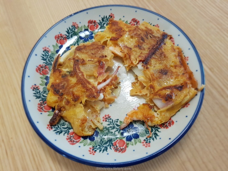 오징어를 너무 많이 넣으면 오징어 전이된다는 것... 오징어 향이 은근 강해서 가능하면 김치보다 양을 줄이거나 김치 국물을 반죽에 섞어줘야, 해물 김치전 맛이 납니다. ㅋ