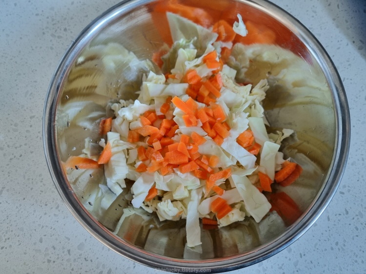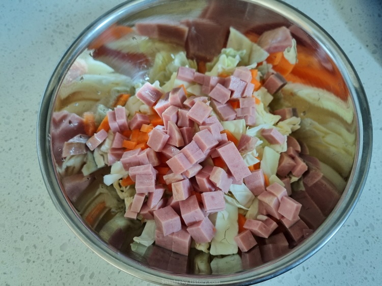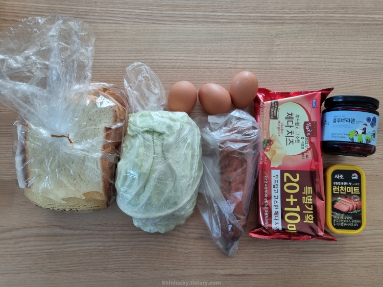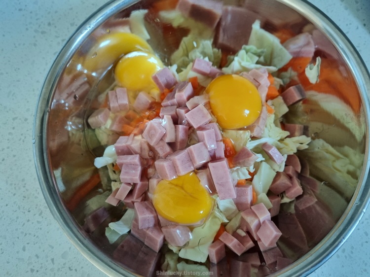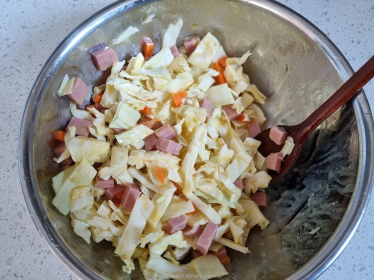 때마침 집에 남은 양배추와 런천미트가 생각나서 냉장고에서 재료들을 주섬주섬 챙겨봤네요 ㅎㅎ.