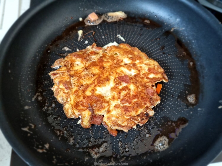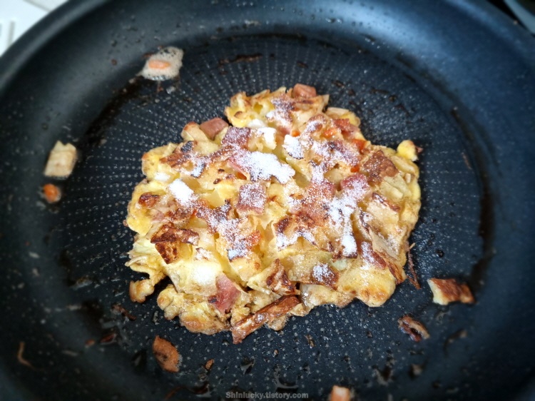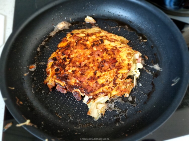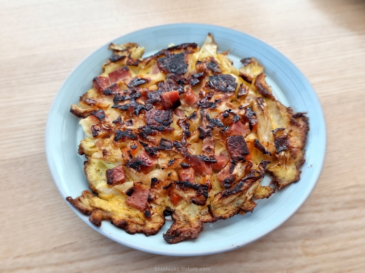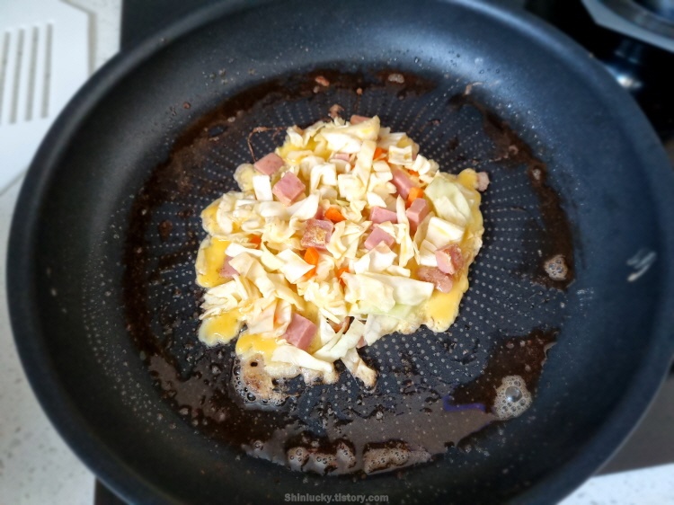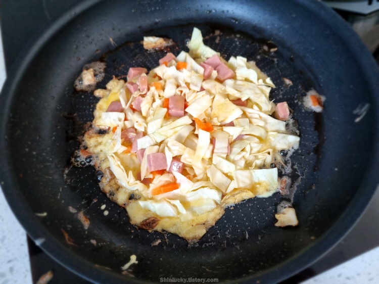 계란과 양배추, 그리고 햄을 이용하여 한층을 만들어