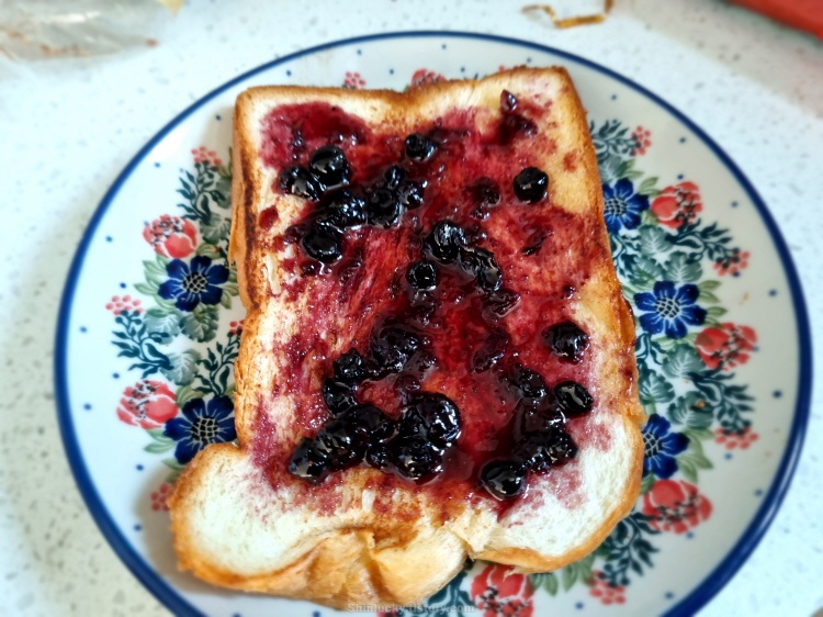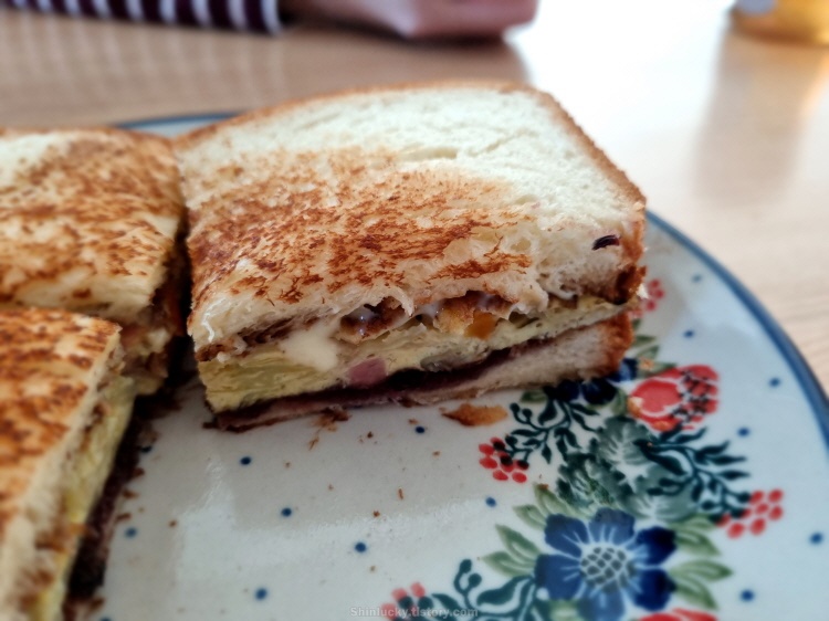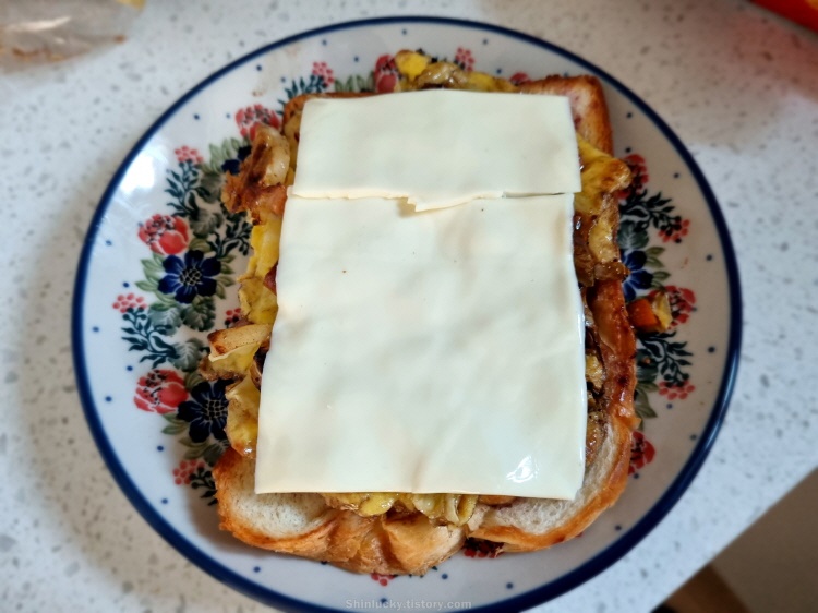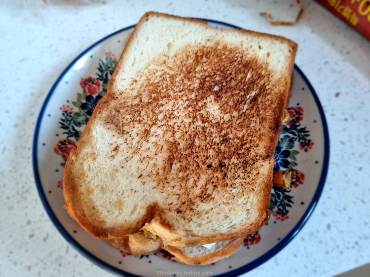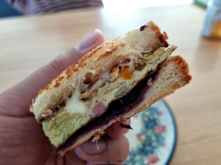 블루베리쨈과 치즈사이에 쏙 넣고, 설탕을 쭈욱 뿌려서 스페셜한 길거리 토스트를 만들어 와이프에게 바쳤습니다~