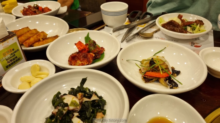 특이한건 반찬들이 많이 나오긴하는데, 고기를 어느정도 먹고나서야 나옵니다.
