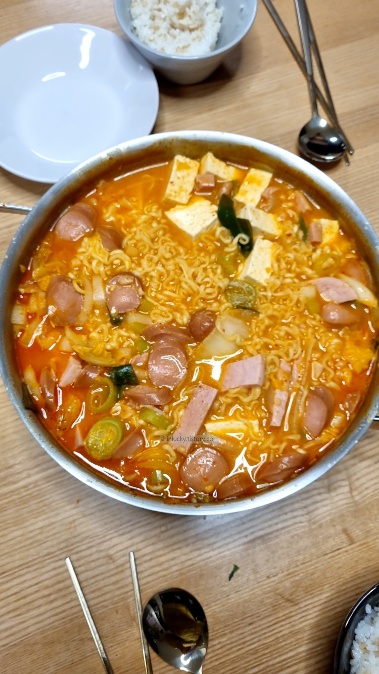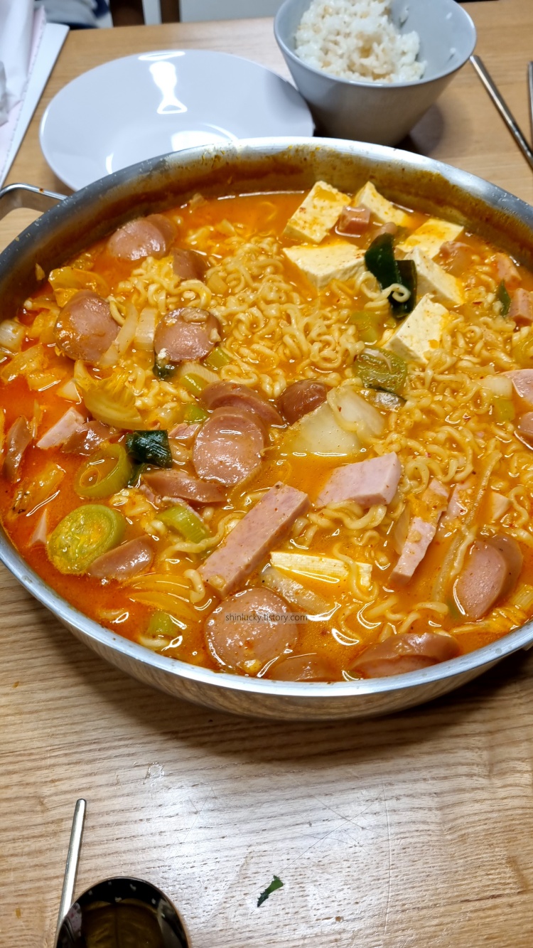 이것저것 아이 간식도 좀 사고, 저희 저녁으로 먹을 송탄식 부대찌개를 주문!