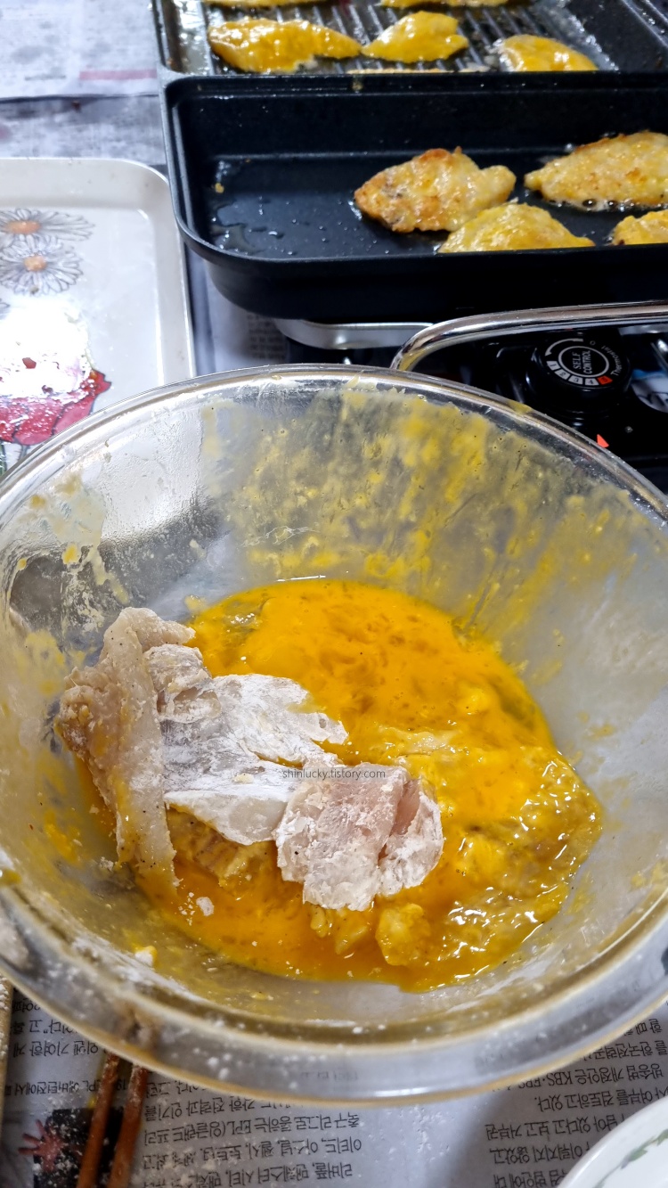 매년 아이가 동태전 밀가루 반죽을 하고, 저는 계란물 입히고, 와이프는 부치는 협업을 진행중입니다!