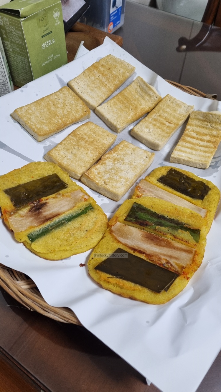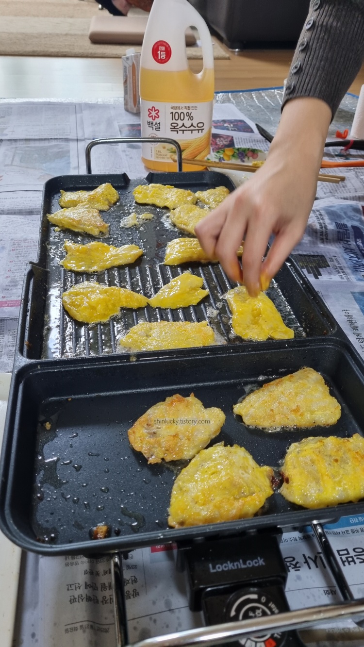 와이프가 열심히 녹두전을 부치고, 아기와 저는 동태전을 같이 만들었네요 ㅎㅎ.