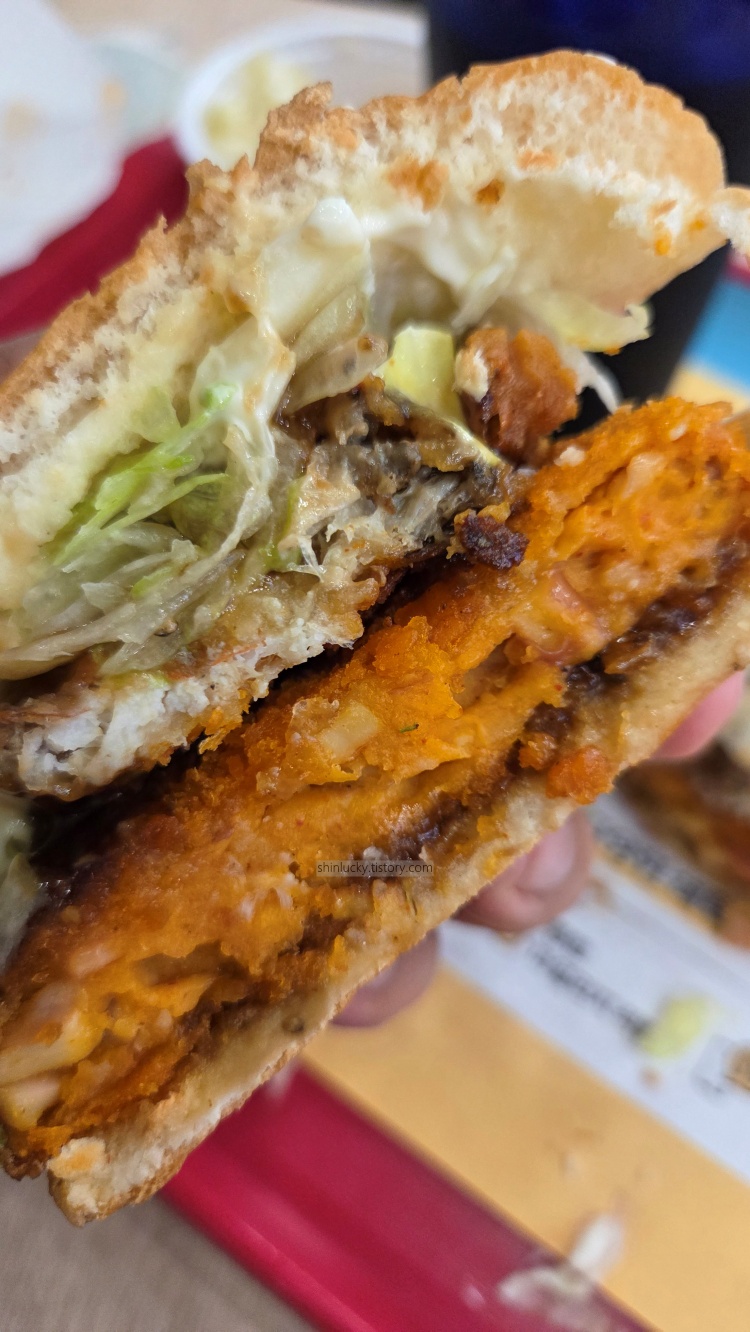 매콤한 오징어패티를 씹은 후에 느껴지는 바삭한 통크랩 식감! 이게 정말 장난 아닙니다.