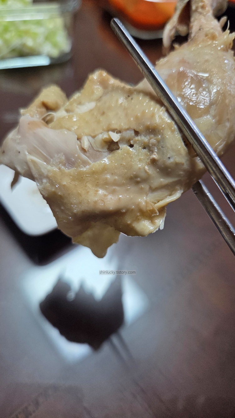 백숙은 푹 고아서 야들야들 부드러워진 살을 소금에 찍어먹으면 꿀맛!